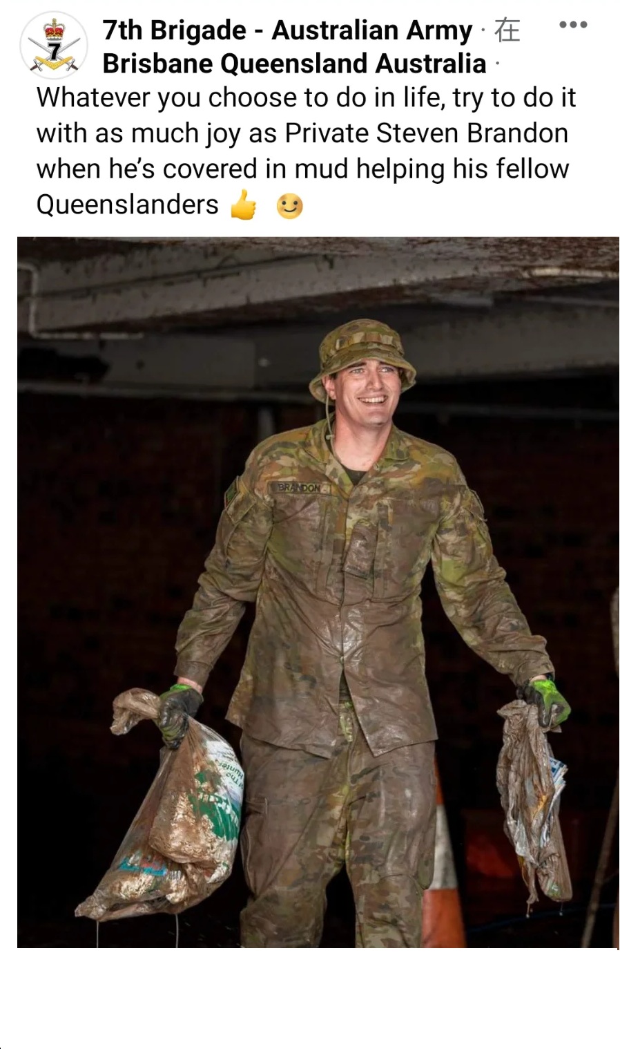 “Whatever you choose to do in life, try to do it with as much joy as Private Steven Brandon when he's covered in mud helping his fellow Queenslanders” — 7th Brigade